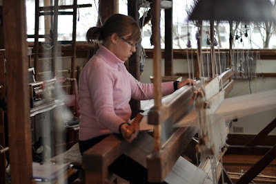 Mary Margaret is gearing up for her third project, a hand dyed wool singles blanket (which we'll follow up on in detail next week), by winding spools from skeins, and then building her three-section warp.