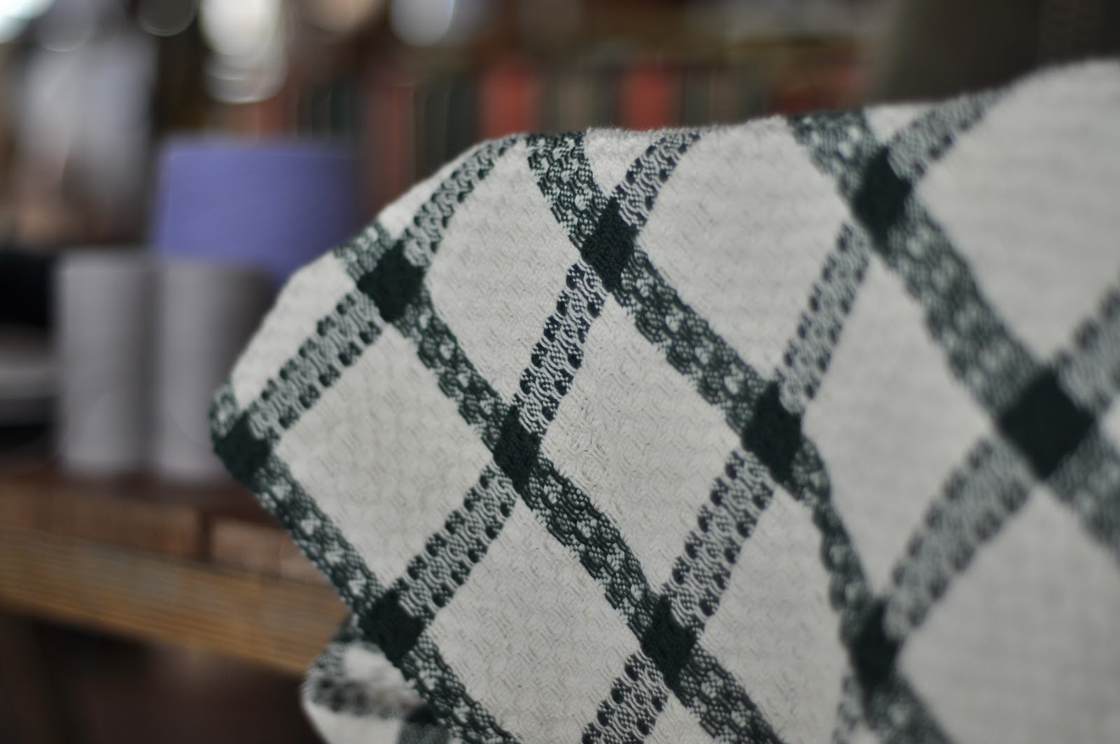 Sally worked on a fine wool baby blanket in a huckaback pattern, with very handsome, classic colors...white and evergreen. Before we knew it she finished up and had hemmed her work.